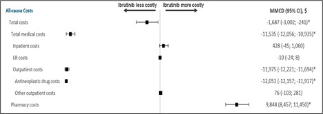 • The study found that total direct costs of care were significantly lower ($1,687 less per month) with Ibrutinib vs CIT in first line treatment of CLL, resulting from higher pharmacy cost of Ibrutinib being fully offset by lower medical cost with Ibrutinib; this was driven mostly by fewer outpatient visits and associated costs (Forrest plot).